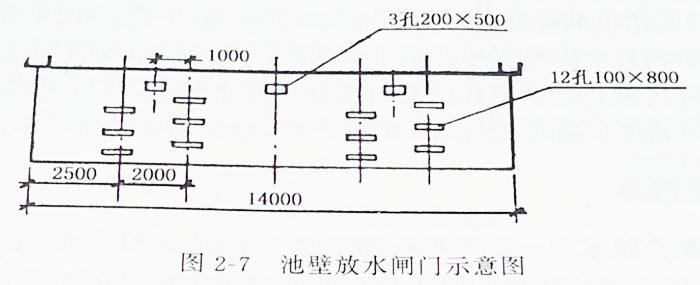 進灰水渠道斷面為50cm×70cm,總長200m。池壁放水閘門(圖2-7)由標高0.3m開始,每隔0.2m設(shè)兩個0.1m×0.8m的排水孔,及標高0.5m、0.7m、0.9m、1.1m和1.3m處各設(shè)兩個。標高1.5m處設(shè)三個0.2m×0.5m的排水孔。排水管道190m,井點抽水設(shè)備兩套。